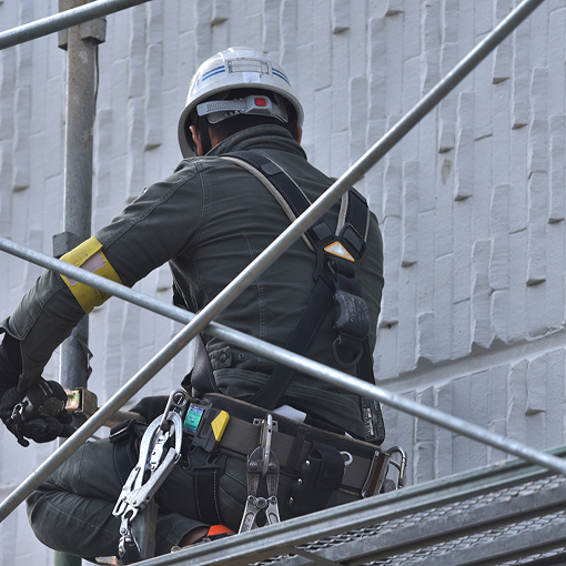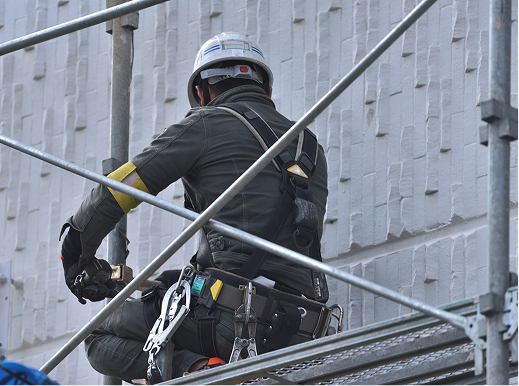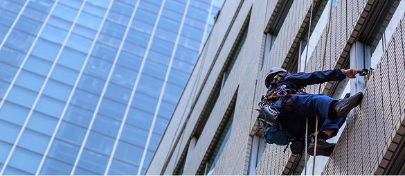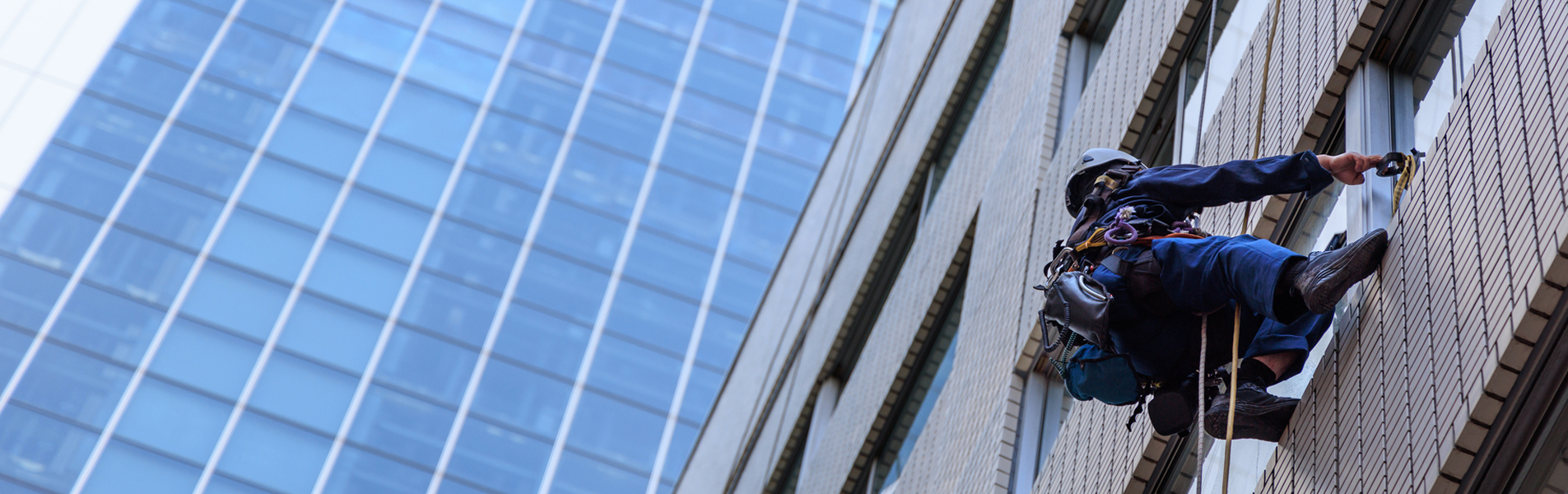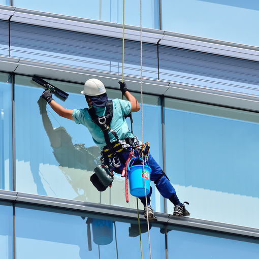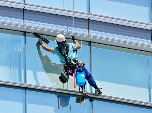 専門資格を持つ作業員が、高所での安全な清掃作業を行います。